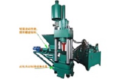 铝屑压块机主机工作程序:上下横梁由立柱和螺母联接,主液压缸前端用法兰联接在横梁底部。模具固定在下横梁上,模套固定在模具内。冲头直接联接在油缸活塞杆顶端。模套和冲头均可拆卸和更换。有一抽板缸位于主机下模具后面。抽板缸前位时与模套形成模腔底部,后位时底部形成空间,利于饼块落下,同时具有推饼出模具底部的功能。螺旋加料装置和加料斗组成自动加料机构。机器的加料由螺旋加料装置完成。充液系统位于横梁侧面,以补充主油缸快速前进所需的油液。