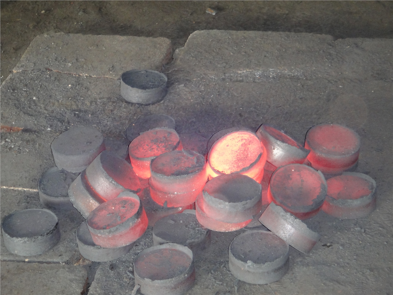 钢渣金属屑热压饼生产线热压成型系统通过倾斜布置加热滚筒,使物料从上端进入,载热体从下端进入,与物料形成逆流接触。随着加热圆筒的转动,钢渣金属屑热压饼生产线在重力的作用下运行到下端,获得热压成型所需的热量。在加热滚筒的末端有一个加热装置,由天然气供应热量。加热筒分为高温区、中温区和低温区。进料端为低温区,由废气直接循环预热。预热后的钢渣颗粒进入中温区进行300℃预热,然后进入高温区进行700℃辐射。烘干后的700℃钢渣金属屑热压饼生产线通过热压输送系统输送至800吨压力机系统进行热压。