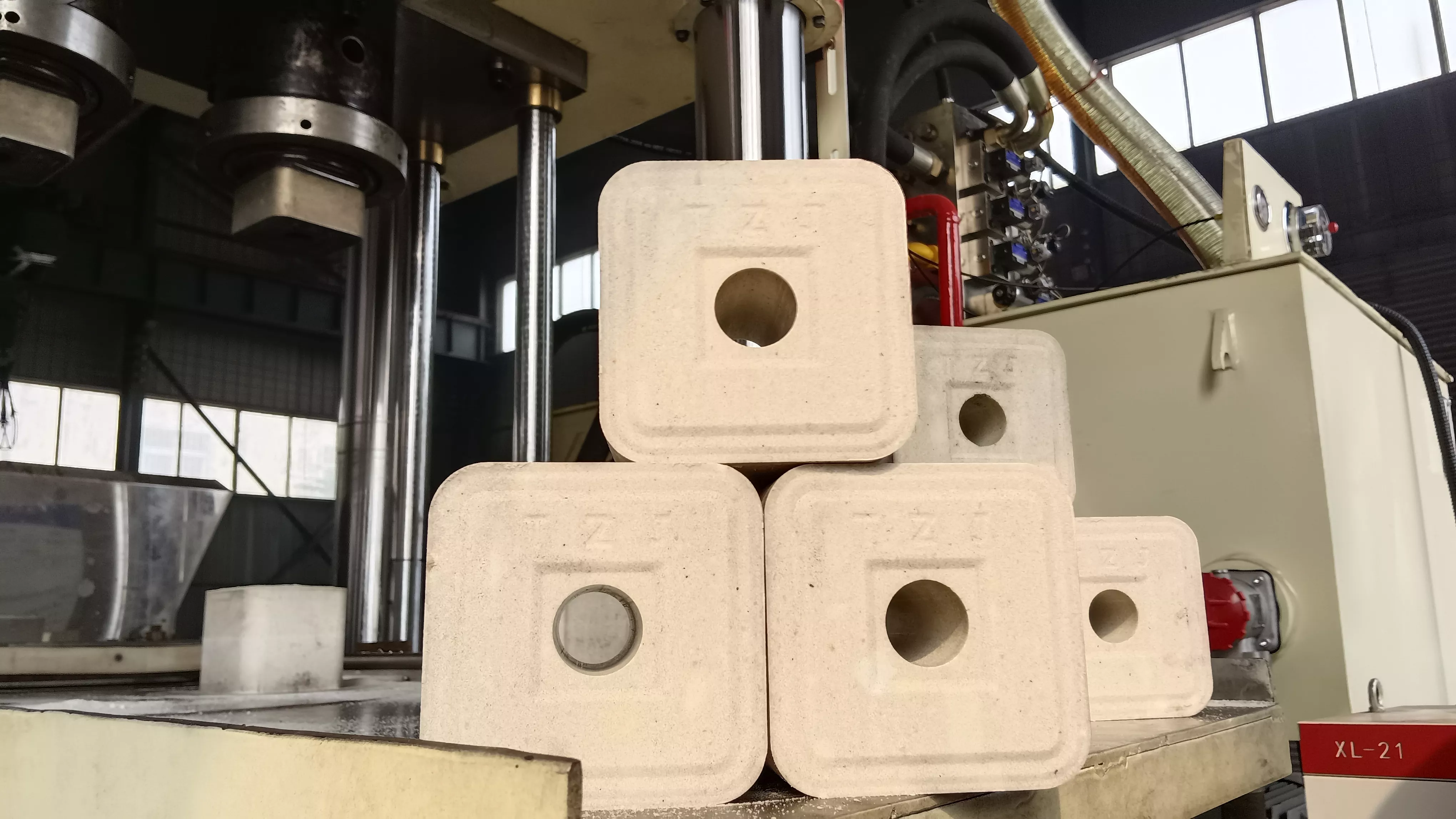 盐砖机主机为四梁四柱结构,配备专用的移粉和液压比例浮动成型技术,使制品成型密度得到有效控制。装料、成型、脱模三位置的机械挡块定位及无级调整机构,确保了制品几何尺寸的稳定可调。台阶类产品移粉位置无级可调,产品密度均匀。