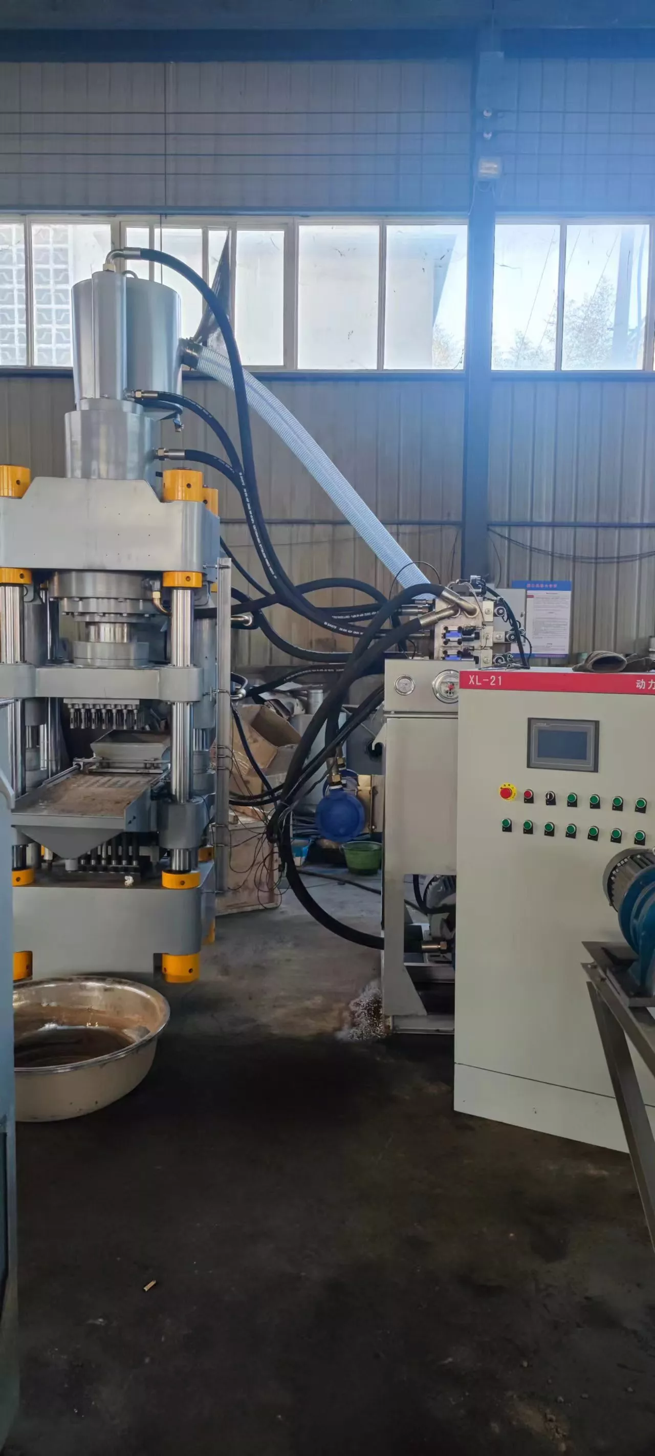 2、采用液压元件,可实现连续正常工作,配装不同模具可制作出各种样式的产品形状,一机多用性能高。
