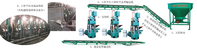 上下横梁由立柱和螺母联接,主液压缸前端用法兰联接在横梁底部。模具固定在下横梁上,模套固定在模具内。冲头直接联接在油缸活塞杆顶端。模套和冲头均可拆卸和更换。有一抽板缸位于主机下模具后面。抽板缸前位时与模套形成模腔底部,后位时底部形成空间,利于饼块落下,同时具有推饼出模具底部的功能。加料缸和加料斗组成自动加料机构。机器的加料由加料缸的往复动作完成。